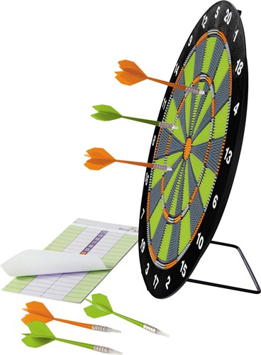 Dart spielen wie die Profis! Mit dieser hochwertigen Dartscheibe in Originalgrösse können junge Dart-Fans alleine spielen oder ein spannendes Dart-Turnier veranstalten. Enthält alles zum Gleich-Losspielen: Dartscheibe, Pfeile und Turnierblock, Pfeile halten sicher auf dem Board und lassen sich leicht abziehen, Pfeile mit Sicherheits-Kunststoffspitze, einfache Montage, für Tisch- oder Wandspiel, drinnen und draussen einsetzbar.