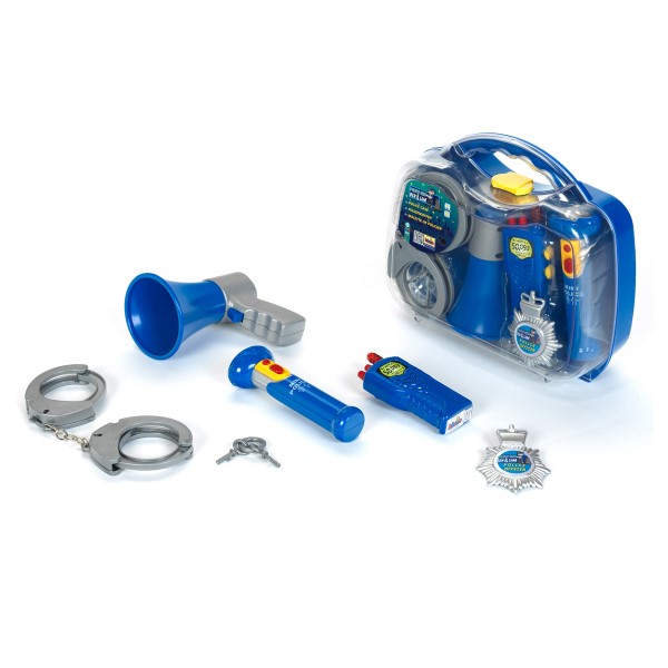 Für alle Polizeifans ist dies ein toller Koffer. Enthalten sind ein Walkie Talkie, ein Megafon, Handschellen mit Schlüssel, Polizeimarke und Taschenlampe.