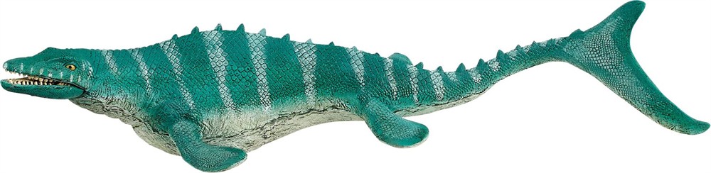 Im beweglichen Kiefer des Mosasaurus von Schleich® DINOSAURS befinden sich viele spitze Zähne. Um Beutetiere wie Fische und Schildkröten zu erlegen, öffnete der Dino ihn ganz weit und biss kräftig zu. Aufgrund der Form seiner Zähne konnte er vermutlich nicht kauen, sondern nur schlucken. Als Anpassung an seinen Lebensraum waren die Vorder- und Hinterbeine zu Flossen umgebildet. Ausserdem besass er am Schwanzende eine grosse Flosse.