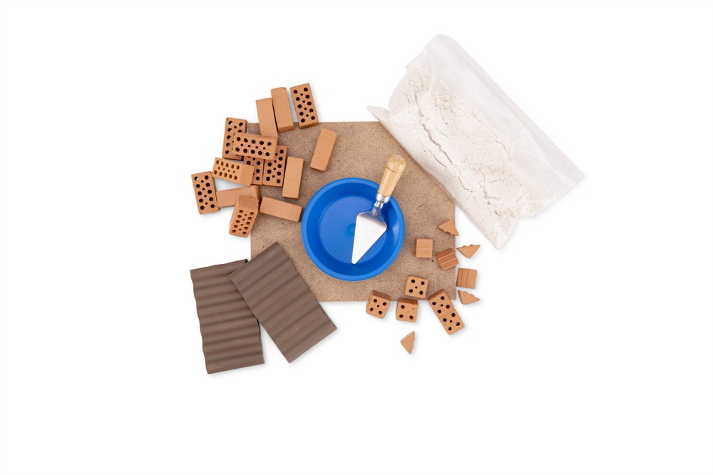 Für echtes Baugefühl sorgen eine Miniatur Maurerkelle und eine Mörtelschale. Die Bodenplatte ist ebenfalls bereits enthalten. Eine bebilderte Bauanleitung sorgt für unkomplizierten Bauspass.