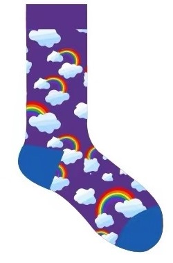 Diese Socken machen aus jedem Tag ein kleines Wetterwunder. Wo andere graue Wolken sehen, tauchen hier gleich mehrere Regenbogen auf und erklären den Alltag offiziell für farbig.