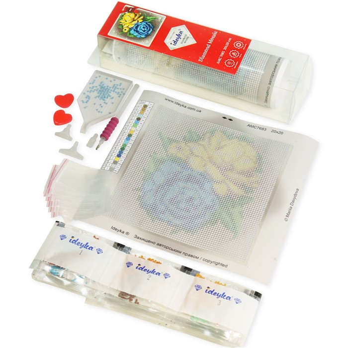 - ein spezieller Stylus-Stift zum Arbeiten mit Strasssteinen mit weichem Halter und 3 zusätzlichen Aufsätzen dafür: für 3 und 9 Strasssteine ??und ein Aufsatz zum Ausrichten von Strasssteinen auf der Leinwand,