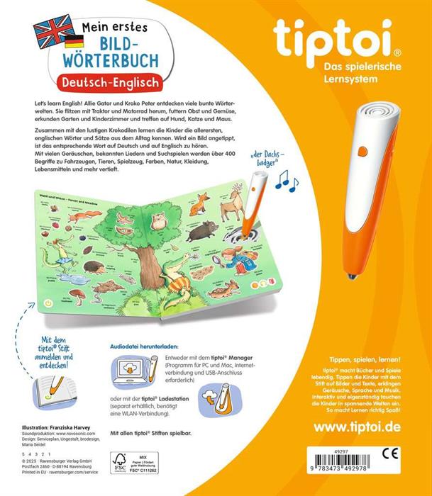 My first English wordsMit den lustigen Krokodilen Allie Gator und Kroko Peter lernen schon die Kleinsten spielend erste englische Wörter. Auf 11 Doppelseiten sind bekannte Tiere und Gegenstände abgebildet von Fahrzeugen über Lebensmittel bis hin zu Spielsachen. Neben jedem Bild steht die jeweilige Bezeichnung auf Deutsch und Englisch. Der tiptoi Stift liest das Wort in beiden Sprachen vor. So lernen die Kinder von Anfang an die korrekte Aussprache und behalten die Wörter gut im Gedächtnis.