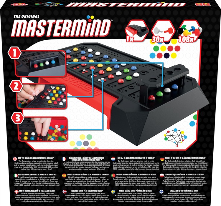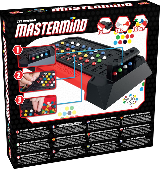 Das Denkduell der Superhirne! Wer knackt den Geheimcode und wird zum Superhirn? Bei Mastermind, dem beliebten Strategiespiel für Familien und Kinder ab 8 Jahren, treten Code-Setzer und Code-Knacker in einem spannenden Denkduell gegeneinander an. Der Code-Setzer stellt mit seinen Stiften einen raffinierten Geheimcode zusammen, der seinen Gegner möglichst lange im Dunkeln tappen lässt. Der Code-Knacker setzt sein logisches Denken und Erinnerungsvermögen ein, um den Code zu entschlüsseln.