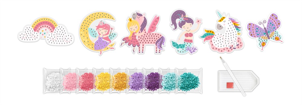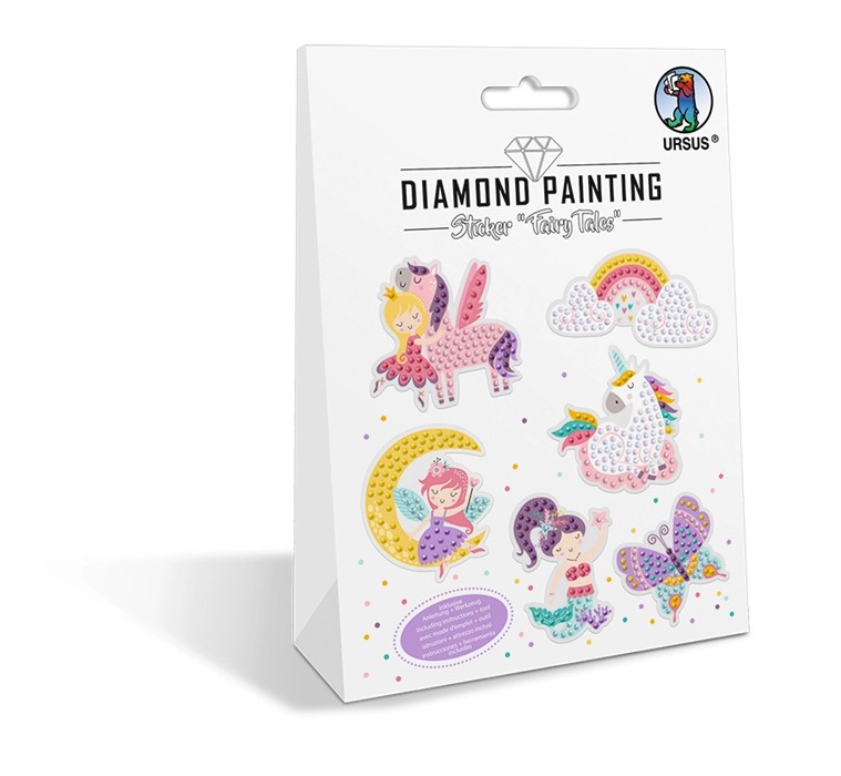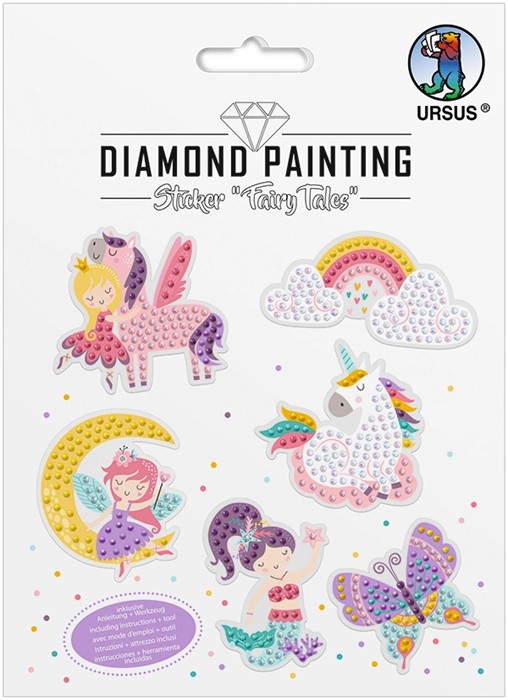 Inhalt: 6 selbstklebende Sticker in verschiedenen Designs und Grössen (ca. 5 - 9 cm), Diamantensteine sortiert in verschiedenen Farben, Werkzeug (1 Picker, 1 Tablett und 1 Wachskleber) und Bastelanleitung