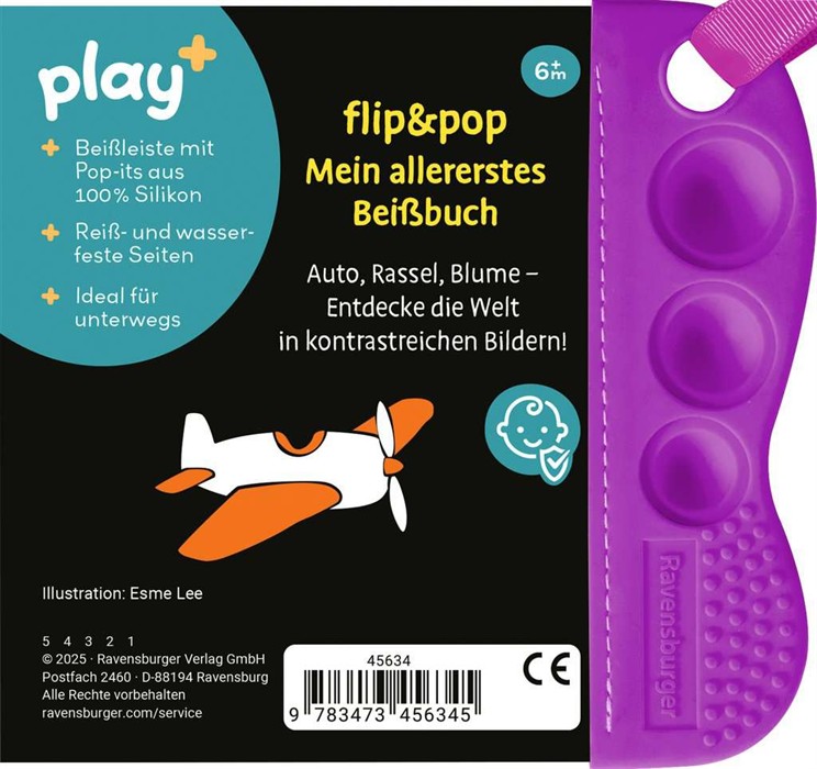 flip&pop Beiss- und reissfestDieses Buch bietet mit der genoppten Silikon-Leiste grossen Beiss- und Spielspass für Babys ab 6 Monaten. Mit unzerreissbaren und wasserfesten Seiten ist das Buch nicht nur ideal für Kinderhände und der perfekte Begleiter für unterwegs, sondern beschäftigt Babys auch beim Baden. Die lustigen Pop-its laden dazu ein, die Welt mit den Händen zu erkunden und fördern ganz nebenbei spielerisch die Feinmotorik. Grosse Kontrastbilder fördern zudem Babys erste visuelle Wahrnehmung.Play+, die neue Baby- und Kleinkindlinie, fokussiert auf eine ganzheitliche frühkindliche Förderung mit der gesamten Erfahrung der Marke Ravensburger. Die abwechslungsreichen Bücher und Spielzeuge von Play+ garantieren Kindern von 0-3 Jahren jede Menge Spass und ermöglichen ein spielerisches Lernen und Entdecken egal ob gemeinsam oder auch allein. Die Bedürfnisse der Kinder und die Anforderungen der Eltern bestimmen die Entwicklung aller Produkte. Der Blick fürs Detail, das besondere Extra und eine moderne Gestaltung machen das Programm von Play+ aus, immer unter Einhaltung der hohen Ravensburger Sicherheits- und Qualitätsansprüche. Denn sicher ist sicher.