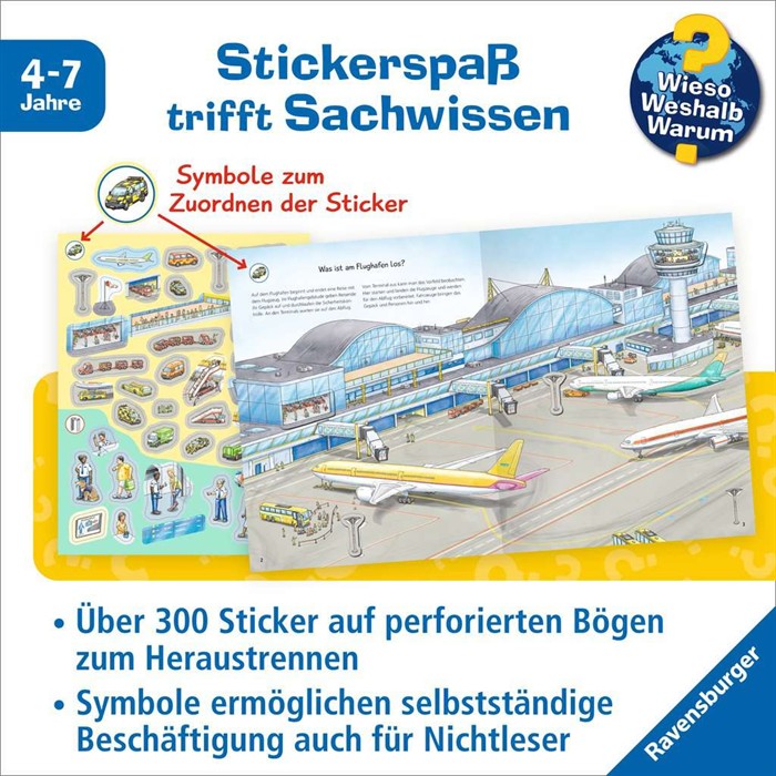 Stickern über den Wolken und auf dem FlughafenWelche Luftfahrzeuge gibt es? Was passiert am Flughafen? Wie sieht das Fliegen der Zukunft aus? Mit über 300 Stickern entdecken Kinder Spannendes rund um Flugzeuge, Hubschrauber und ihre Einsätze. Sie durchlaufen Check-in und Sicherheitskontrolle, stickern Fracht in den Laderaum, machen ein Flugzeug startklar und lassen es abheben. Spannende Szenen und jede Menge Sachwissen begeistern für Technik. Mit diesem Heft im Handgepäck vergeht das Warten am Flughafen auf der nächsten Reise wie im Flug.Wieso? Weshalb? Warum? Stickerheft für Kinder von 47 JahrenMit Stickern spielerisch Wissen vermitteln die Wieso? Weshalb? Warum? Stickerhefte machen es möglich. Die aufwändig illustrierten Seiten können Kinder mit über 300 Aufklebern ergänzen und kreativ frei gestalten. Die Sticker sind nicht nur dekorativ einige veranschaulichen Bewegungen und Abläufe, andere ermöglichen spannende Einblicke oder vervollständigen Puzzlebilder. Eine Lösungsseite unterstützt bei kniffligeren Aufgaben. Symbole zeigen, welche Sticker zu welcher Doppelseite gehören.So können sich auch Nichtleser mit den Stickerheften selbstständig beschäftigen und sich ihre Lieblingsthemen aktiv und eigenhändig erschliessen.Kurze Sachtexte zum Vor- und Selbstlesen erklären kindgerecht die detailreichen Bilder. Auf diese Weise vereinen die Hefte dieser Beschäftigungsreihe Stickerspass und Sachwissen.