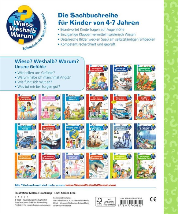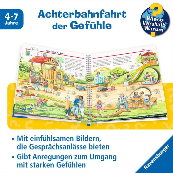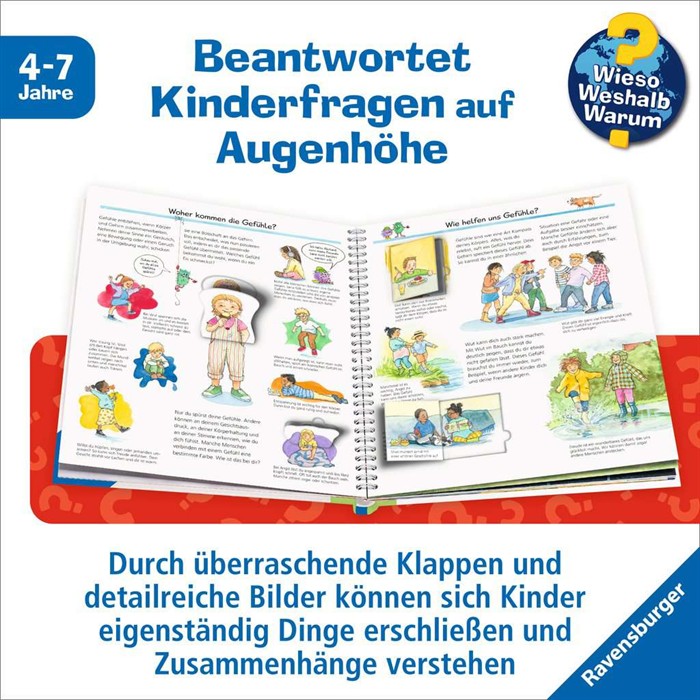 Alle Gefühle sind wichtig!Wie können uns Gefühle helfen? Wo spüren wir sie? Und wann fühlen wir uns überfordert? Dieses Buch hilft dabei, Gefühle zu benennen und mit ihnen umzugehen. Klappen nehmen die Kinder mit auf die Achterbahnfahrt der Gefühle: Ein Kind wird von einem Geschenk überrascht, ein anderes vertraut sich seinem Opa an und fühlt sich danach besser. Zahlreiche Alltagssituationen fördern Empathie. Besonders toll: Eine Gefühlsuhr zum Drehen lädt dazu ein, über die eigenen Gefühle zu sprechen.Wieso? Weshalb? Warum?Die Sachbuchreihe für Kinder von 47 JahrenJeden Tag entdecken Kinder etwas Neues da kommen viele Fragen auf. Warum sind die Dinosaurier ausgestorben? Wo ist die Sonne in der Nacht? Wozu brauchen wir das Blut? Die beliebte Sachbuchreihe Wieso? Weshalb? Warum? gibt Kindern Antworten auf Augenhöhe. Dabei werden die unterschiedlichsten Themen aus der Alltags- und Interessenswelt der Kinder altersgerecht und mit viel Liebe zum Detail unter die Lupe genommen.Detailreiche Bilder, verständliche Sachtexte und überraschende Klappen, die Bewegungen oder Abläufe veranschaulichen und hinter die Dinge blicken lassen, ermöglichen Kindern, sich ihre Themen selbst zu erschliessen. Der Spass am eigenhändigen Entdecken, die liebevolle Umsetzung und die qualitativ hochwertige Ausstattung garantieren langanhaltende Freude an jedem einzelnen Buch.