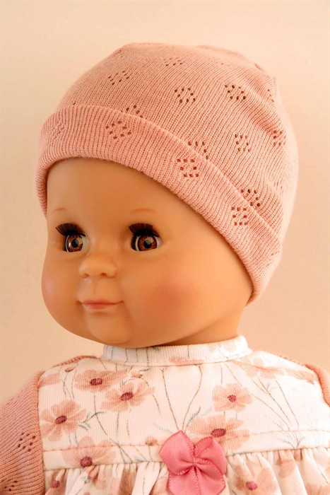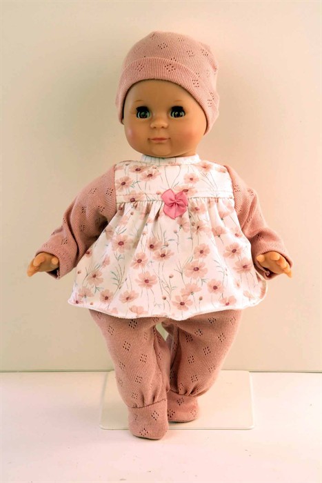 Mein erstes ?Schlummerle?, die beliebteste und bekannteste Puppe, ohne Haare für die Kleinsten. Ein unverwechselbares Gesicht vereint Qualität und Spielwert und begeistert schon seit Generationen unsere Puppenmuttis.Die Puppe wird in unserer eigenen Puppenmanufaktur in Rauenstein/Thüringen hergestellt. Arme, Beine und Kopf sind aus Vinyl, sie hat lustige braune Schlafaugen und gemalte Haare. Es trägt einen rose Strickoverall mit angenähtem Blumenkleid und eine Strickmütze. Die Kleidung ist leicht an- und ausziehbar und bei 30 Grad per Hand waschbar.