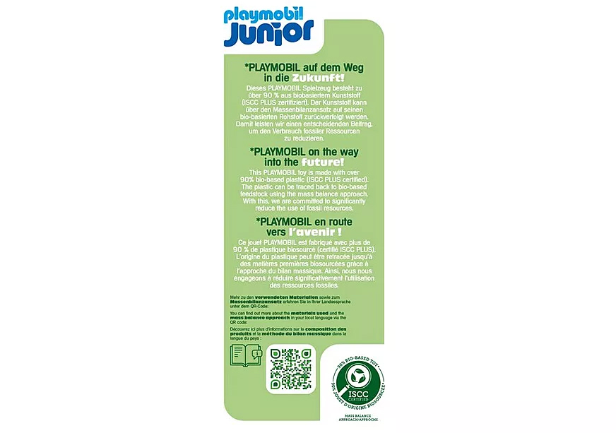 Alle PLAYMOBIL JUNIOR Sets bestehen zu über 90 % aus bio-basiertem Kunststoff (ISCC PLUS zertifiziert). Dank Massenbilanzverfahren lässt sich das Material auf nachwachsende Rohstoffe zurückverfolgen ein wichtiger Schritt zur Reduzierung fossiler Ressourcen.