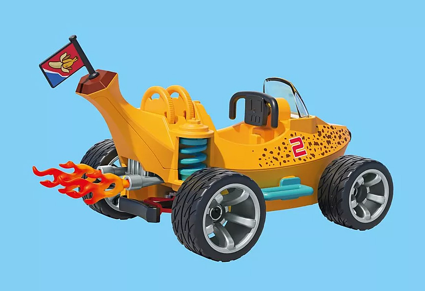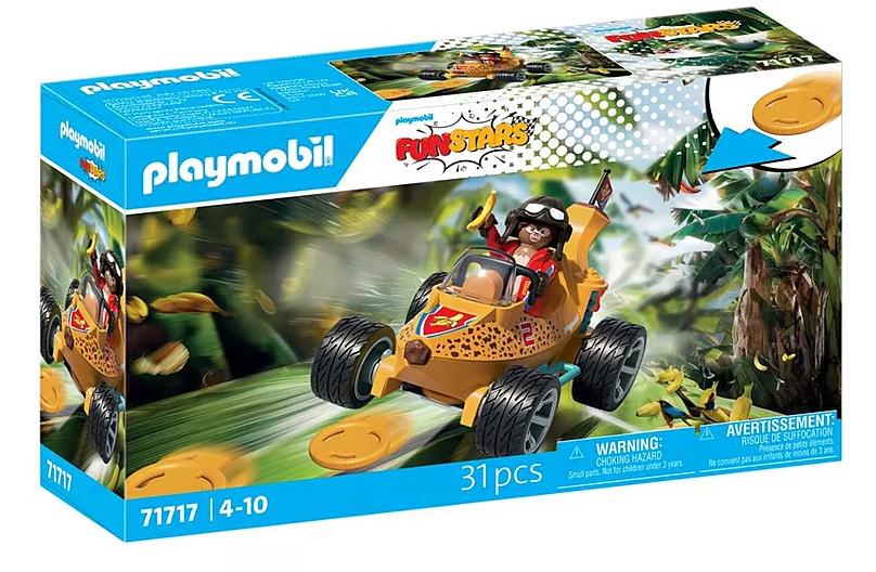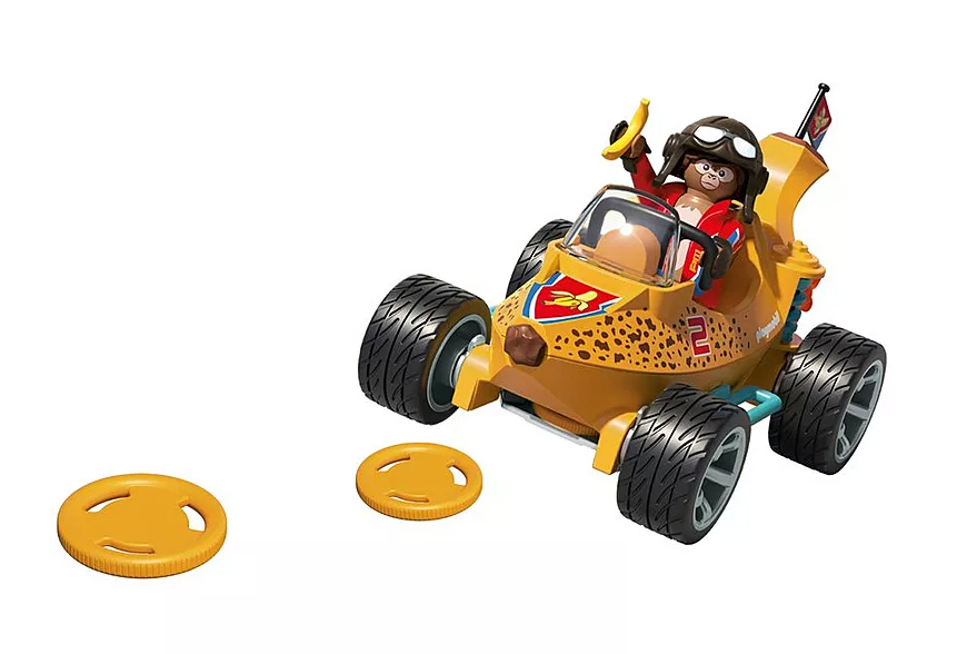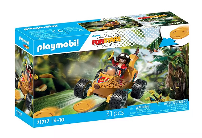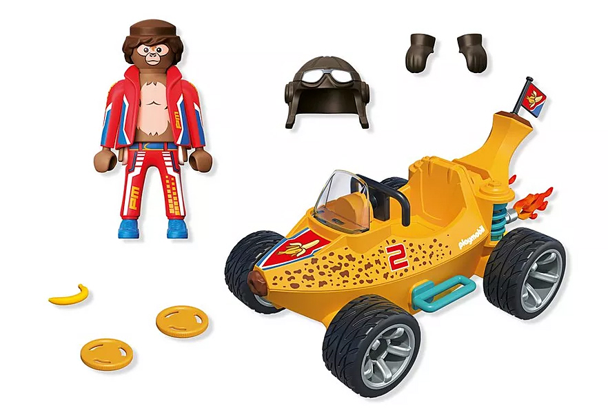 Mit dem PLAYMOBIL Funstars-Set „Rasende Banane wird die Rennstrecke zur Dschungel-Arena! Das Bananen-Fahrzeug beeindruckt mit seinem Disc-Shooter, der die Konkurrenz mit gezielten Schüssen aus dem Rennen wirft, und einem Feuerantrieb, der für extra Geschwindigkeit sorgt. Im Cockpit sitzt der Affen-Rennfahrer mit stylischer Pilotenbrille, perfekt geschützt hinter der robusten Frontscheibe seines schnittigen Bananen-Flitzers. Ob beim spannenden Wettrennen oder wilden Abenteuerfahrten die Rasende Banane garantiert tierischen Spielspass für Kinder ab 4 Jahren!