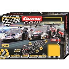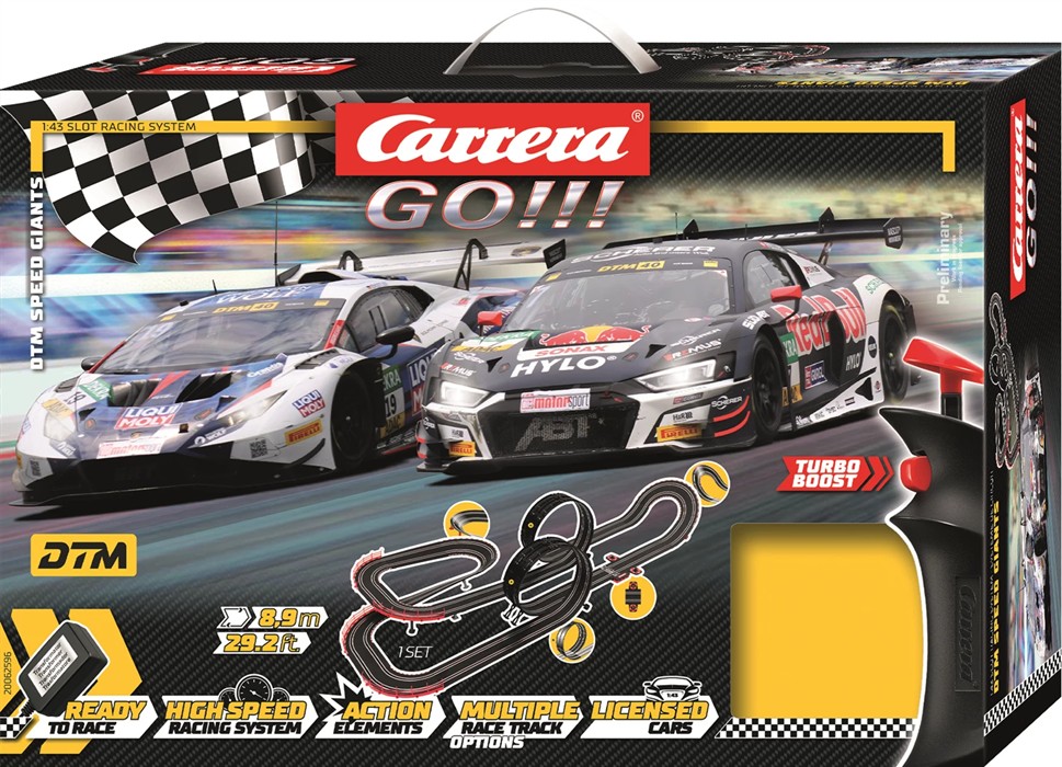Speed Giants ist das deutsch-schweizerische Duell zweier 25-jähriger DTM-Fahrer. Der Deutsche Luca Engstler startet seit 2023 in der DTM und holte letztes Jahr mit dem Lamborghini Huracán GT3 Evo2 in Oschersleben seinen ersten Sieg. Der Aargauer Ricardo Feller fährt schon ein Jahr länger in der DTM und beendete die Serie in Engstlers Rookie-Jahr auf Platz 3. Seinen ersten DTM-Sieg errang er am 19. Juni 2022 in Imola. Carrera GO-Bahn: Massstab 1:43 - Streckenlänge 8.9 m - Aufbaumasse 220 x 98 cm - Trafo 61531 - Fahrzeuge 64249/64276 Audi R8 LMS GT3 DTM, No.7 (Ricardo Feller) & Lamborghini Huracán GT3 Evo2 (Luca Engstler) - mit Fly-Over, Steilkurve 1/45° (61612), Geraden, Kurve 1/90° (61603), Rundenzählerschiene (88107), 2 Handreglern mit Turboboost 61663 & Anschlussschiene 61666.
