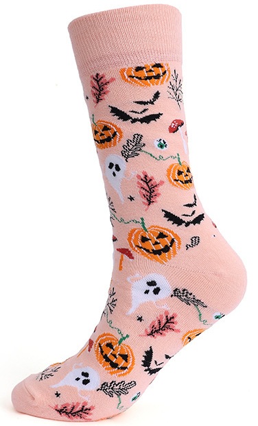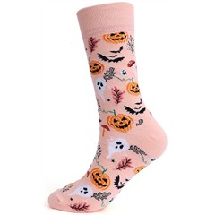Rosa Socken mit gruselig-verspieltem Halloween-Muster, das richtig gute Laune macht. Kleine Geister, schwarze Fledermäuse, Kürbisse mit fiesen Fratzen und herbstliche Blätter sorgen für den perfekten Mix aus Spuk und Spass.