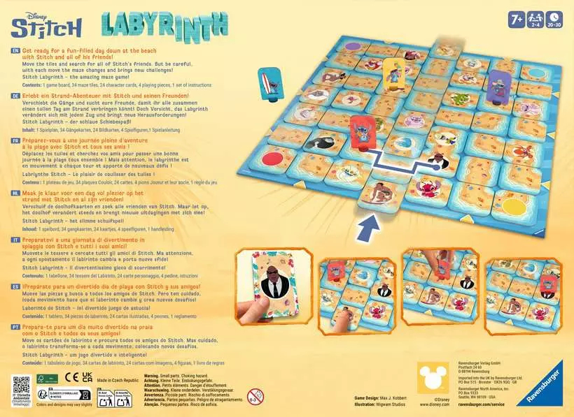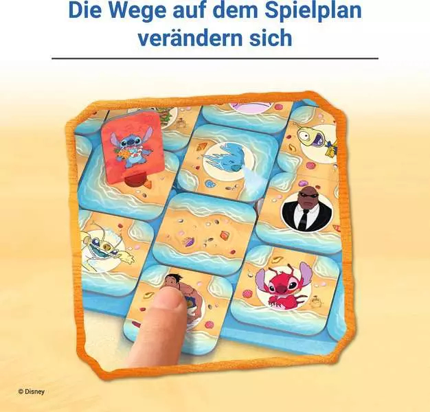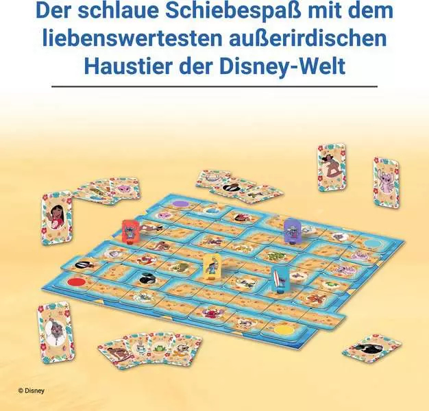 Ein unvergesslicher Spieleabend mit Stitch für die ganze Familie: Das beliebte Schiebespiel mit den geliebten Charakteren aus Lilo & Stitch begeistert kleine und grosse Fans gleichermassen. In diesem Brettspiel für 2-4 Personen ab 7 Jahren wählen alle Personen eine Stitch-Spielfigur. Ziel ist es, durch geschicktes Verschieben der Wege im Labyrinth zu Stitchs Alienfreunden zu gelangen. Wer als erstes alle gesuchten Figuren findet, gewinnt das Spiel!Der schlaue Schiebespass! Spielregeln schnell erklärt: Die Labyrinth-Karten werden beliebig auf dem Spielplan verteilt und es entsteht ein zufälliges Labyrinth. Eine Karte bleibt übrig, damit wird das Labyrinth verschoben. Wer an der Reihe ist verschiebt zuerst das Labyrinth und zieht anschliessend mit seiner Spielfigur auf den neu entstandenen Wegen voran, um die gesuchte Figur zu erreichen. Das Labyrinth wird bei jedem Spielzug verändert. Es entstehen dabei immer neue Wege aber auch Sackgassen. Nur wer dabei den Überblick bewahrt, wird Wege zu den gesuchten Figuren finden und am Ende das Spiel gewinnen. Ein Kultspiel mit grenzenlosem Spielspass für die ganze Familie!
