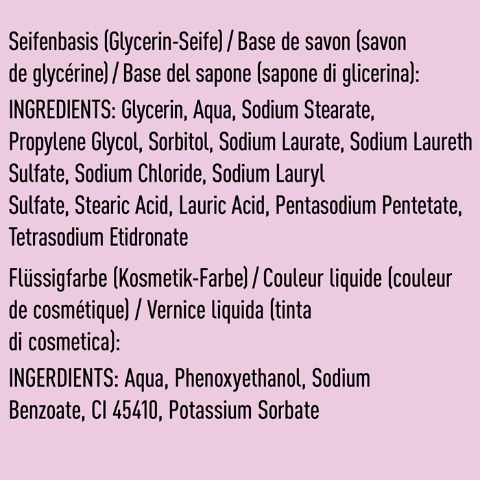 Dieses Produkt enthält kosmetische Mittel (Glycerin-Seife und Flüssigfarbe), die nach dem Öffnen 6 Monate haltbar sind. Die fertig hergestellte Seife nach dem Experimentieren bitte zügig verbrauchen. Nicht lagern. Nicht einnehmen. Von Kleinkindern fernhalten.