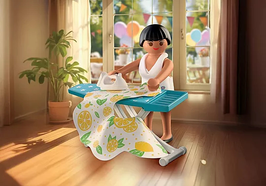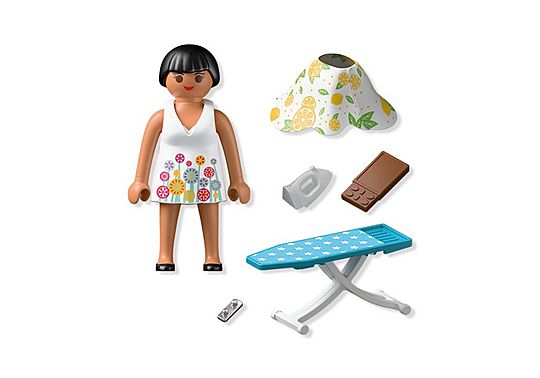 Auf dem Bügelbrett wird noch schnell das Outfit geglättet, bevor es losgeht. Die Figur kann wahlweise das Bügeleisen oder ein süsses Präsent in Form einer Pralinenschachtel in die Hand nehmen ideal als Geschenk für die Gastgeberin der Sommerparty.
