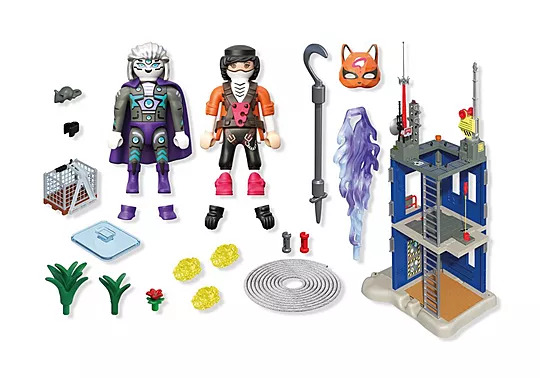 Zubehör: 1 Bodenplatte, 1 Gebäude, 1 Dachaufbau mit Kran, 4 Holzdielen, 2 Leitern, 7 Steine, 1 Hängeschild, 1 Fuchsmaske, 2 Handschuhe, 1 Klettergeschirr, 1 stabförmige Wurfwaffe, 2 Schuhe, 1 Umhang, 2 Blitze, 1 Dynamitstange mit Auslöser, 1 Sendemast, 1 Antenne, 1 Seilwinde, 1 Palette, 1 Gitterkorb, 1 Seil, 1 Etikettenbogen, 2 Pflanzen, 7 Rohrelemente