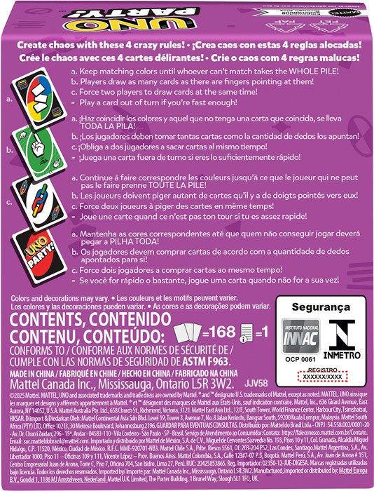 Bei dem Kartenspiel UNO Party machen alle mit: das klassische UNO-Spiel mit neuen Sonderkarten und speziellen Regeln für große Gruppen und endlosen Partyspaß! Ziel des Spiels ist es auch hier, passende Farben und Zahlen zu finden es gibt allerdings jede Menge zusätzliche Karten. Dank bis zu 14 Spielern kann eine Spielrunde ganz schön laut und verrückt werden! Die Regeln dieser Version sehen vor, dass Spieler Karten so lange weitergeben, bis jemand nicht mehr spielen kann. Zudem wird auf Spieler gezeigt, damit sie Karten ziehen, und zwei Spieler werden miteinander verbunden, die dann jeweils immer ziehen müssen, wenn der andere Spieler auch zieht. Es gibt sogar eine neue Schnellspielregel. Für 6 bis 14 Spieler ab 7 Jahren verspricht UNO Party viel Spielspaß für Familien und Freunde auf Partys und bei Spieleabenden! Abweichungen in Farbe und Gestaltung vorbehalten.