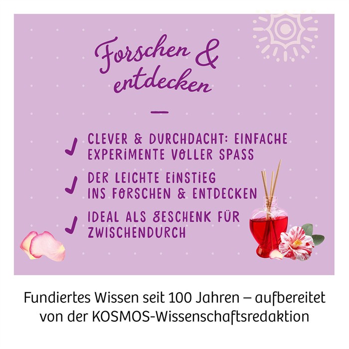 Mit diesem einzigartigen Experimentierkasten können Kinder ab acht Jahren ihre ganz eigenen Raumdüfte kreieren und dabei in die spannende Welt der Parfüm-Herstellung eintauchen. Dank kreativer Zusatzexperimente, Duft-Spielen und DIY-Projekten lässt sich ausserdem die Welt des Riechens ganz neu entdecken und tolle Dekorationen fürs eigene Kinderzimmer herstellen. Mit diesem Set sind dem Ausprobieren keine Grenzen gesetzt: es enthält neben einer Raumduftbasis, flüssigem Glycerin und einem hübschen Deko-Flakon auch Bastelartikel sowie Experimentierzubehör wie Messbecher, Trichter, Pipetten und Spatel. Mit nur wenigen haushaltsüblichen Zusatzmaterialien lassen sich ausserdem viele weitere Duft-Projekte realisieren.