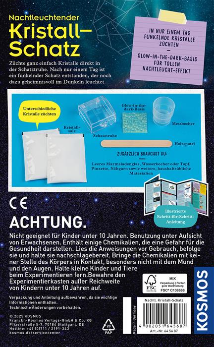 Glitzernde Kristalle, die im Dunkeln leuchten: Mit diesem KOSMOS-Experimentierset züchten Kinder ab zehn Jahren ihren eigenen nachtleuchtenden Kristall-Schatz. Die Handhabung ist dabei einfach und besonders zuverlässig: Ist die Alaun-Kristalllösung einmal angerührt, wird sie in die eigens dafür vorgesehene Schatztruhe gefüllt und schon nach wenigen Stunden kann man dem Kristall-Schatz beim Wachsen zuschauen. Die besondere Bodeneinlage der Truhe sorgt für ein mystisches Leuchten der transparenten Kristalle im Dunkeln. So wird jedes Kinderzimmer zur geheimnisvollen Schatzkammer!