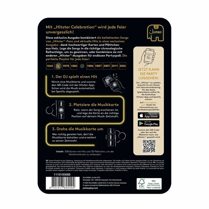 Hitster Celebration Mix bietet eine festliche Mischung aus Festtagsliedern und Hits für Zusammenkünfte, darunter auch Weihnachts- und Silvesterlieder. Es eignet sich hervorragend für gesellige Veranstaltungen, bei denen die Spieler die chronologische Reihenfolge der Lieder erraten können. Mit über 300 Liedern verspricht es ein unterhaltsames Musikerlebnis.