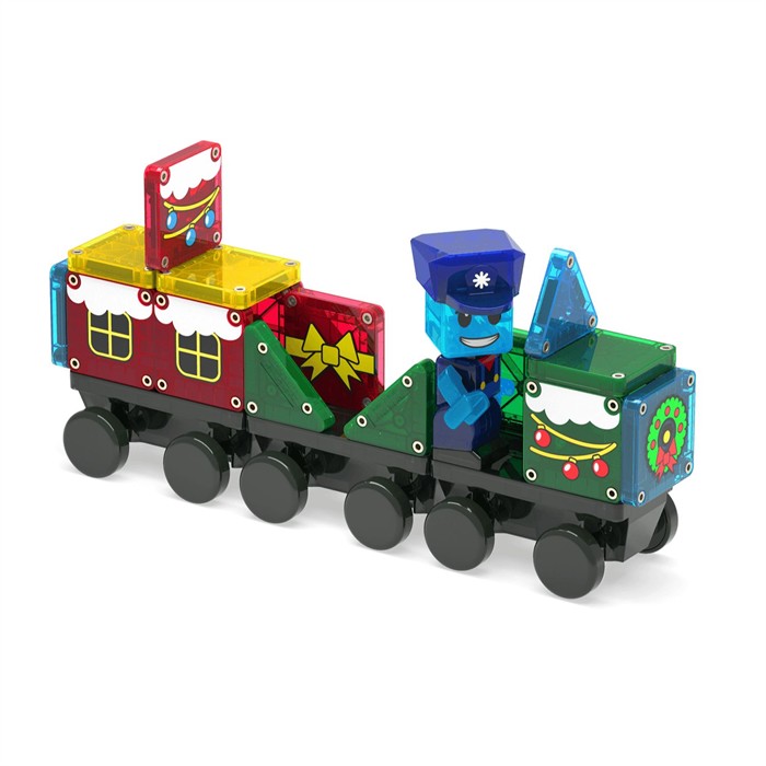 34 weihnachtliche MAGNA-TILES®, darunter Santa, Zugführer, 10 dekorierte microMAGS, 3 bedruckte Dreiecke und 1 microChassis.