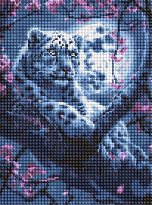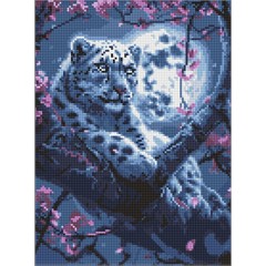 Ein mystisches Motiv in sanften Blautönen: Ein Schneeleopard ruht majestätisch auf einem Ast, umgeben von blühenden Zweigen, während der Vollmond den Nachthimmel erhellt. Das Spiel aus Licht und Schatten verleiht dem Bild Tiefe und Ruhe ein Werk, das Kraft und Stille zugleich ausstrahlt. Dieses Diamond Painting fasziniert durch seine geheimnisvolle Atmosphäre und seine harmonischen Farben.