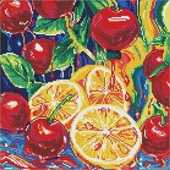 Ein fröhliches und lebendiges Motiv: Strahlend rote Kirschen und leuchtend gelbe Zitronenscheiben verschmelzen zu einem spritzigen Farbenspiel, das pure Sommerfrische ausstrahlt. Die kräftigen Farben und der Glanz der Steine machen dieses Bild zu einem echten Hingucker in jeder Küche oder im Esszimmer.