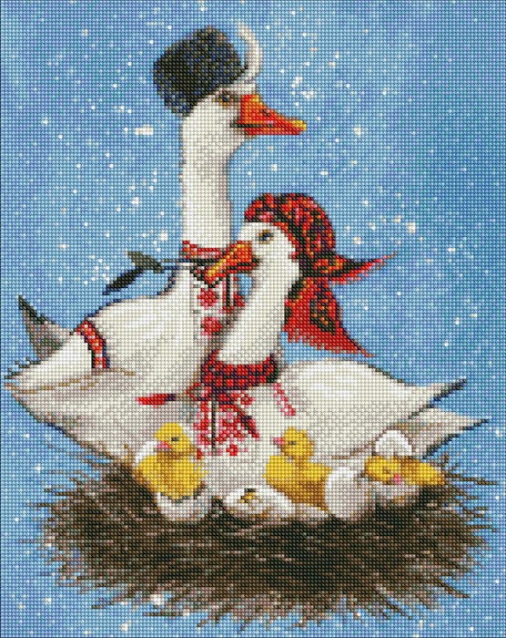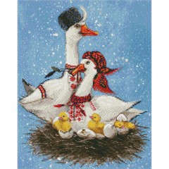 Ein herzerwärmendes Familienmotiv: Zwei stolze Gänseeltern in traditioneller Kleidung, umgeben von ihren flauschigen Küken im Nest. Das Bild strahlt Geborgenheit und Harmonie aus perfekt, um deinem Zuhause eine liebevolle, fröhliche Note zu verleihen.