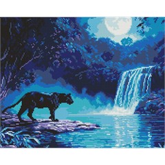 Ein faszinierendes Motiv in geheimnisvollen Blautönen: Eine schwarze Grosskatze schleicht lautlos am Ufer entlang, während im Hintergrund ein Wasserfall im Mondlicht glitzert. Dieses stimmungsvolle Bild vereint Kraft, Eleganz und Ruhe ein eindrucksvolles Kunstwerk für alle Naturliebhaber.