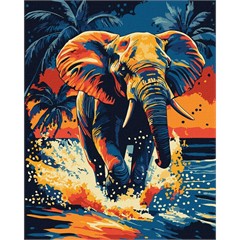 Ein kraftvolles, farbenfrohes Motiv voller Energie: Ein majestätischer Elefant stürmt durch das Wasser, während hinter ihm die Sonne untergeht. Die intensiven Blau-, Orange- und Gelbtöne schaffen ein tropisches Farbenspiel, das die Wildheit und Schönheit der Natur eindrucksvoll einfängt.