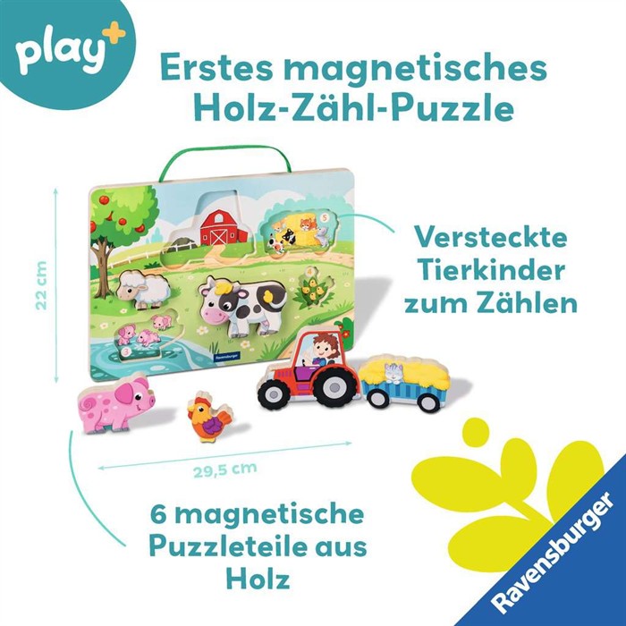 Dieses magnetische 3 in 1 Holz-Zähl-Puzzle und Balancierspiel sorgt bei Kindern ab 1 Jahr für langanhaltenden Spielspass. 6 stabile Bauernhof-Tiere aus Holz animieren zum Puzzeln, geschickten Balancieren und freien Spielen. Versteckte Tierkinder laden zum Zählenlernen von 15 ein. So fördert dieses Holzpuzzle spielerisch Feinmotorik, Kreativität und Mengenverständnis. Dank magnetischer Puzzleteile und praktischem Tragegriff ist das Aufräumen und Mitnehmen kinderleicht und nichts geht verloren.Play+, die neue Baby- und Kleinkindlinie, fokussiert auf eine ganzheitliche frühkindliche Förderung mit der gesamten Erfahrung der Marke Ravensburger.Die abwechslungsreichen Bücher und Spielzeuge von Play+ garantieren Kindern von 0-3 Jahren jede Menge Spass und ermöglichen ein spielerisches Lernen und Entdecken egal ob gemeinsam oder auch allein.Die Bedürfnisse der Kinder und die Anforderungen der Eltern bestimmen die Entwicklung aller Produkte. Der Blick fürs Detail, das besondere Extra und eine moderne Gestaltung machen das Programm von Play+ aus, immer unter Einhaltung der hohen Ravensburger Sicherheits- und Qualitätsansprüche. Denn sicher ist sicher.