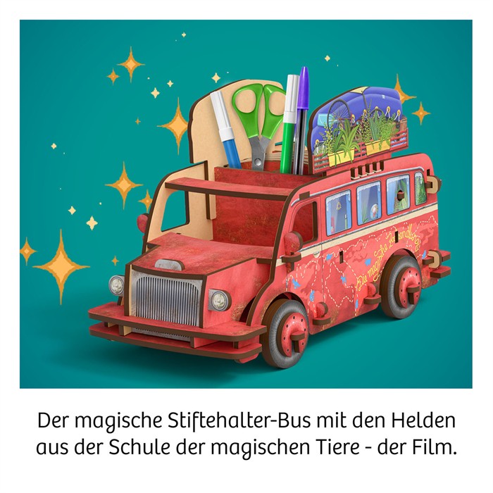 Fans aufgepasst! Der legendäre Bus, mit dem die Tiere im Film zu „ihren Kindern gebracht werden, kommt jetzt ins eigene Zimmer gefahren! Ganz einfach lässt sich der Kult-Bus aus hochwertigen Holzteilen zusammenstecken und als praktischen Organizer nutzen. So finden Stifte, Notizzettel, Schere & Co. fast wie von Zauberhand ihren Platz auf dem Schreibtisch. Aber natürlich ist das noch nicht alles! Sieben spannende Mini-Experimente passend zu den Tieren. Die perfekte Kombination aus Bastelspass, Wissen und einer Prise Magie.