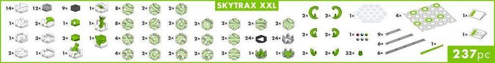 56 Skytrax Spurensteine, 12 Slides, 24 Skytrax Höhensteine, 24 halbe Skytrax Höhensteine, 32 Connectoren, Skytrax Start, Skytrax Ziel, 4 Bodenplatten, 9 Kurze Schienen, 6 Mittlere Schienen, 6 Lange Schienen, 6 Kugeln, 1 grosse Transparente Ebene, 1 Scoop, 1 Flip, 1 Gauss-Canone, 1 Spirale, 12 Höhensteine, 9 halbe Höhensteine, 10 Kurve, 2 Kreuzungen, 1 Wirbel, 3 Basisstein offen, 1 Basisstein geschlossen, 1 3-in-1, 2 Weichen, 1 Freifall, 2 Fänger, 1 Magnetic Stick