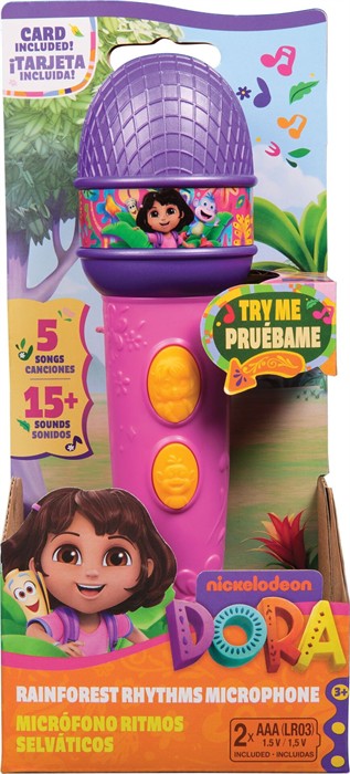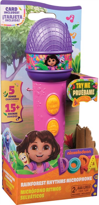 Ein exotischer Ort, der Regenwald, mit spannenden Tieren, bunten Farben und liebenswerten Charakteren, das ist die Welt von Dora, dem selbstbewussten kleinen Mädchen, das Musik liebt und immer abenteuerlustig unterwegs ist. In dieser Rolle begeistert sie Vorschulkinder in der beliebten, gleichnamigen TV-Serie. Da Kinder gerne das nachspielen, was sie sehen, bietet die Firma Spin Master, bekannt durch Produkte zu den Serien PAW Patrol, Rubble und Crew sowie Gabby s Dollhouse, eine breite Produktlinie an Puppen, Spielfiguren, Spielsets und interaktiven Spielzeugen (alle separat erhältlich) zur Serie. Da Musik eine grosse Rolle in der Show spielt, wird das Regenwald Musik Mikrofon kleine Fans besonders begeistern. Damit können sie 4 Lieder mitsingen und 8 Geräuscheffekte lernen. Das Mikrofon lässt sich auf Deutsch oder Italienisch einstellen, damit Kinder in ihrer Muttersprache singen können. Zwei AAA Batterien sind bereits enthalten. Für zusätzlichen Rollenspielspass wird eine Karte mitgeliefert.
