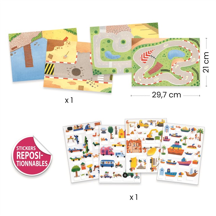 Mit diesen farbenfrohen Stickern von Djeco entsteht eine lebhafte Baustellen- und Fahrzeugwelt! Die wiederverwendbaren Aufstell-Sticker lassen sich kinderleicht anbringen und immer wieder neu positionieren so entstehen spannende Szenen mit Lastwagen, Bagger, Betonmischer und vielen weiteren Fahrzeugen.