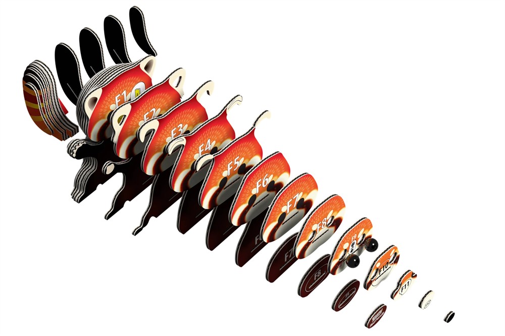 Die nummerierten Kartonteile werden Schritt für Schritt zusammengesteckt und mit dem beiliegenden, ungiftigen Kleber fixiert. In etwa 20 Minuten entsteht so ein fröhlicher Roter Panda, der Bastelspass, Lernen und Dekoration auf charmante Weise verbindet.