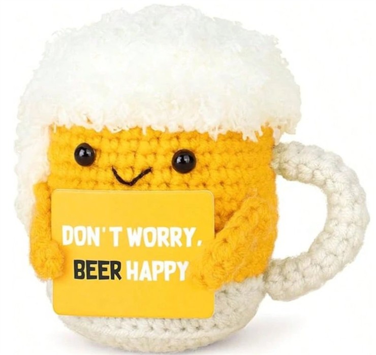 Ein kleiner Gute-Laune-Spender mit grossem Charme! Der gestrickte Bierkrug mit Schaumkrone und fröhlichem Gesicht zaubert jedem ein Lächeln ins Gesicht. Mit seinem Schild „Dont worry, beer happy ist er das perfekte Geschenk für alle, die Humor und Gemütlichkeit lieben.