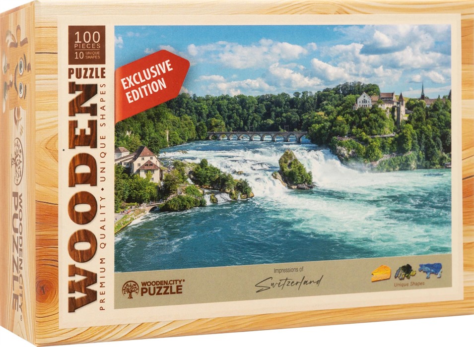 Ein beeindruckendes Schweizer Naturwunder als hochwertiges Holzpuzzle. Dieses Motiv zeigt die majestätischen Rheinfälle bei Schaffhausen Europas grössten Wasserfall mit der historischen Brücke und dem idyllischen Schloss Laufen im Hintergrund.