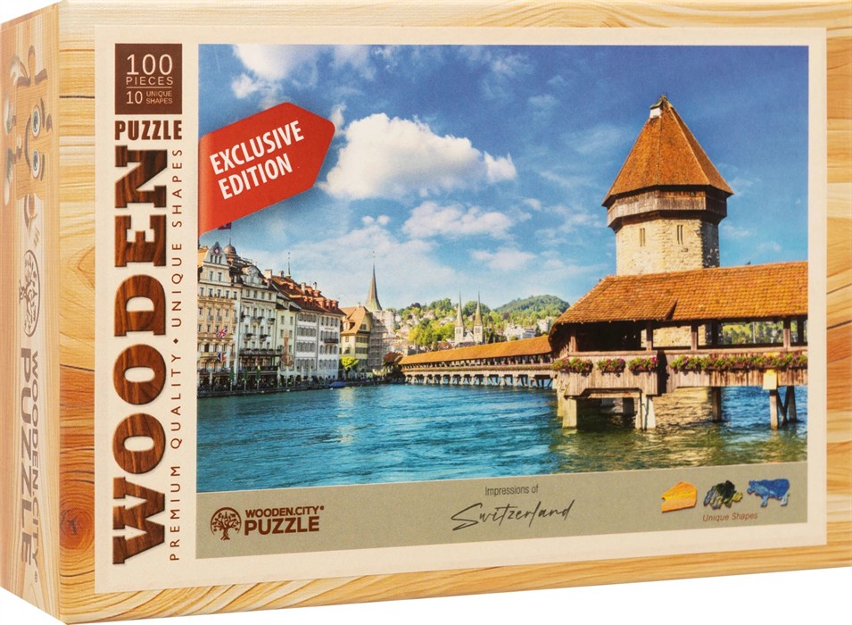 Ein Schweizer Wahrzeichen als hochwertiges Holzpuzzle. Dieses Motiv zeigt die berühmte Kapellbrücke in Luzern mit dem historischen Wasserturm eines der meistfotografierten Bauwerke der Schweiz.