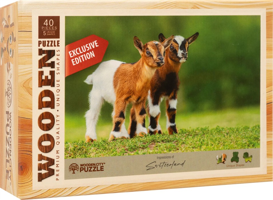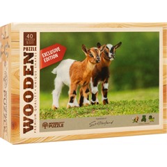 Ein herziges Bauernhof-Motiv für alle Tierliebhaberinnen und -liebhaber. Dieses hochwertige Holzpuzzle zeigt zwei neugierige Zicklein auf einer grünen Wiese ein idyllischer Moment aus der Schweizer Natur.