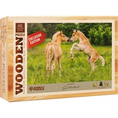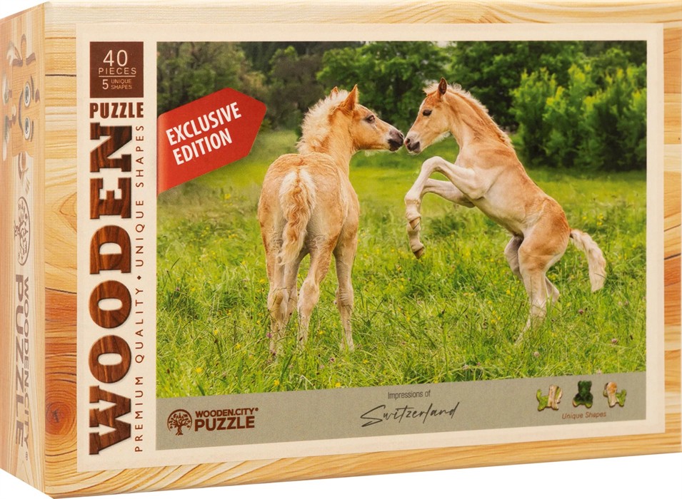 Ein lebendiges und herziges Naturmotiv für alle Pferdefans. Dieses hochwertige Holzpuzzle zeigt zwei verspielte Fohlen auf einer grünen Wiese ein idyllischer Moment voller Leichtigkeit und Lebensfreude.