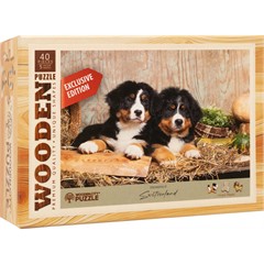 Ein besonders herziges Motiv für alle Hundefreundinnen und -freunde. Dieses hochwertige Holzpuzzle zeigt zwei süsse Berner Sennenhund Welpen auf einem gemütlichen Bauernhof ein liebevoller Moment voller Wärme und Natürlichkeit.