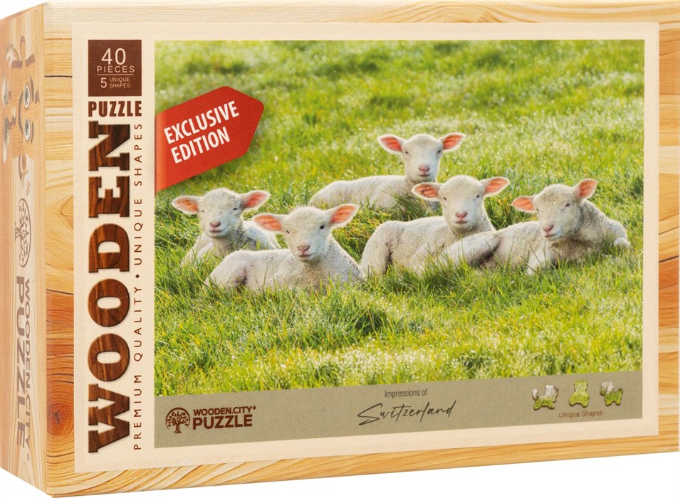 Ein besonders liebevolles Naturmotiv für kleine und grosse Tierfreunde. Dieses hochwertige Holzpuzzle zeigt fünf süsse Lämmer, die entspannt im saftigen grünen Gras liegen ein idyllischer Moment aus der Schweizer Landschaft.