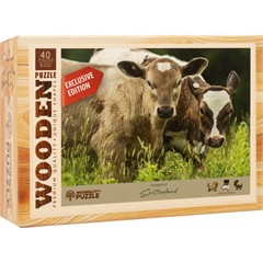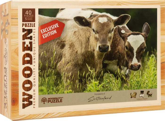 Ein besonders liebevolles Bauernhof-Motiv für kleine und grosse Tierfreunde. Dieses hochwertige Holzpuzzle zeigt zwei neugierige Kälber auf einer grünen Wiese ein ruhiger und natürlicher Moment aus der Schweizer Landschaft.