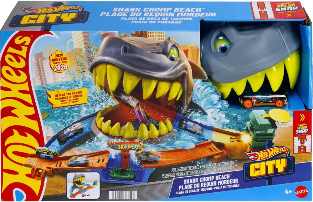 Mit diesem actiongeladenen Spielset aus der Hot Wheels City Reihe wartet ein echtes Abenteuer am Strand! Der riesige Hai lauert im Wasser und versucht, vorbeifahrende Autos zu verschlingen. Kinder schicken ihr Hot-Wheels-Auto über die Strecke direkt auf den Hai zu aber nur mit dem richtigen Timing gelingt es, dem gefährlichen Gebiss zu entkommen und den Hai zu besiegen.