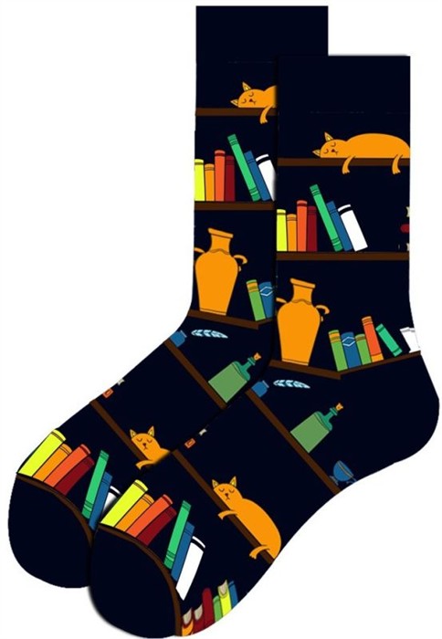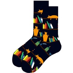 Diese Socken erzählen stille Geschichten: schlafende Katzen, vollgestopfte Bücherregale und ein Hauch von gemütlicher Nachtruhe. Genau die richtige Mischung aus Ordnung und Chaos so, wie es Katzen eben mögen.