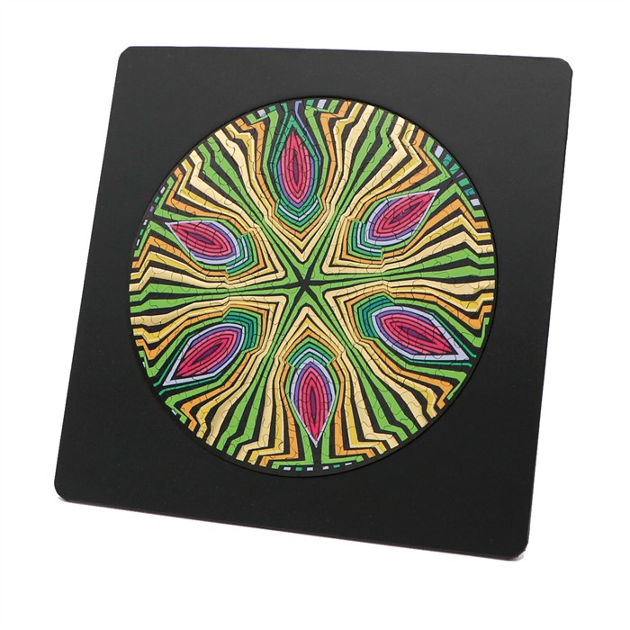 Dieses runde Holzpuzzle ist ein echter Hingucker und eine tolle Herausforderung für Puzzlefans. Die intensiven Farben und das psychedelische Muster machen das Zusammensetzen besonders spannend und dank zwei Motiven auf Vorder- und Rückseite wird es garantiert nie langweilig.