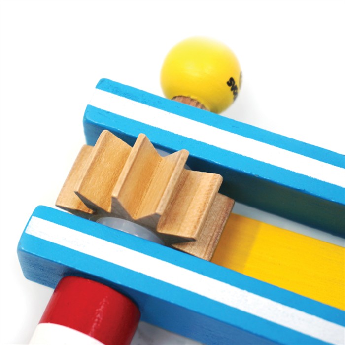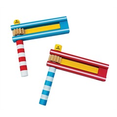 Bist du bereit, ein bisschen Lärm zu machen? Schnapp dir die bunte Holzratsche, schüttle sie herum und höre den Klang. Ein klassisches Spielzeug, das entwickelndes Greifen und aufmerksames Zuhören fördert, während man Spass hat.