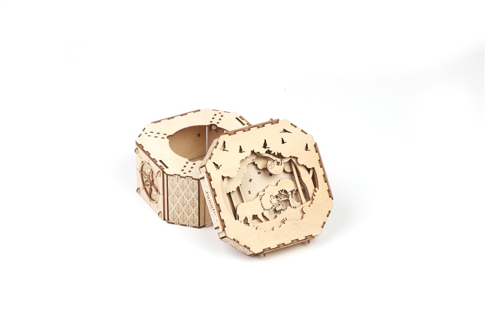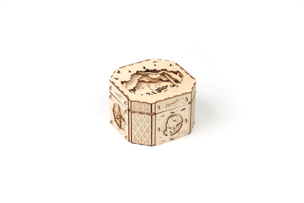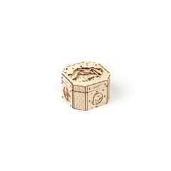 Nach dem Zusammenbau dieses aus lasergeschnittenen Präzisions-Holzteilen bestehenden Kistchens erhält man einen wunderbaren Aufbewahrungsort für kleine Geheimnisse, der durch einen auf dem physikalischen Prinzip der Zentrifugalkraft basierenden Geheimverschluss geschützt ist.